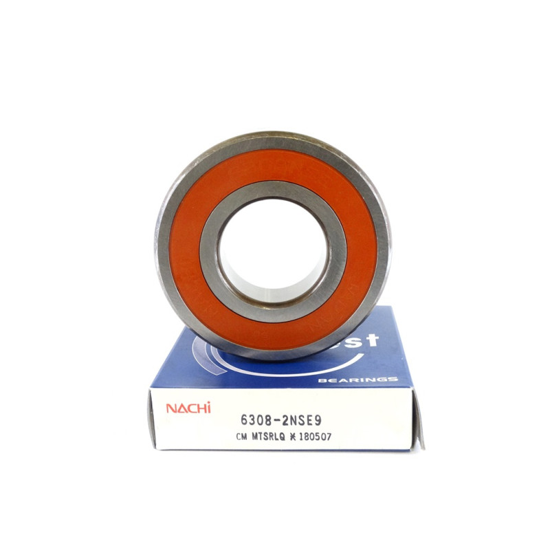 Підшипник 6308 2NSE9 NACHI, закритий з двох сторін контактними ущільненнями (шайбами). Контактні ущільнення виготовлені зі спеціального каучуку, армованого листової сталлю (масло і зносостійкі) забезпечують щільний контакт з виточенням на внутрішньому кільці для підвищення ефективності ущільнення. Підшипник містить мастило.